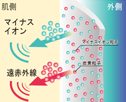 炭素粒子とマイナスイオン粒子は表面に塗っているわけではなく、ナノテクノロジーで「練り込まれている」ので、お洗濯を繰り返してもその機能が落ちにくいのがポイントです。