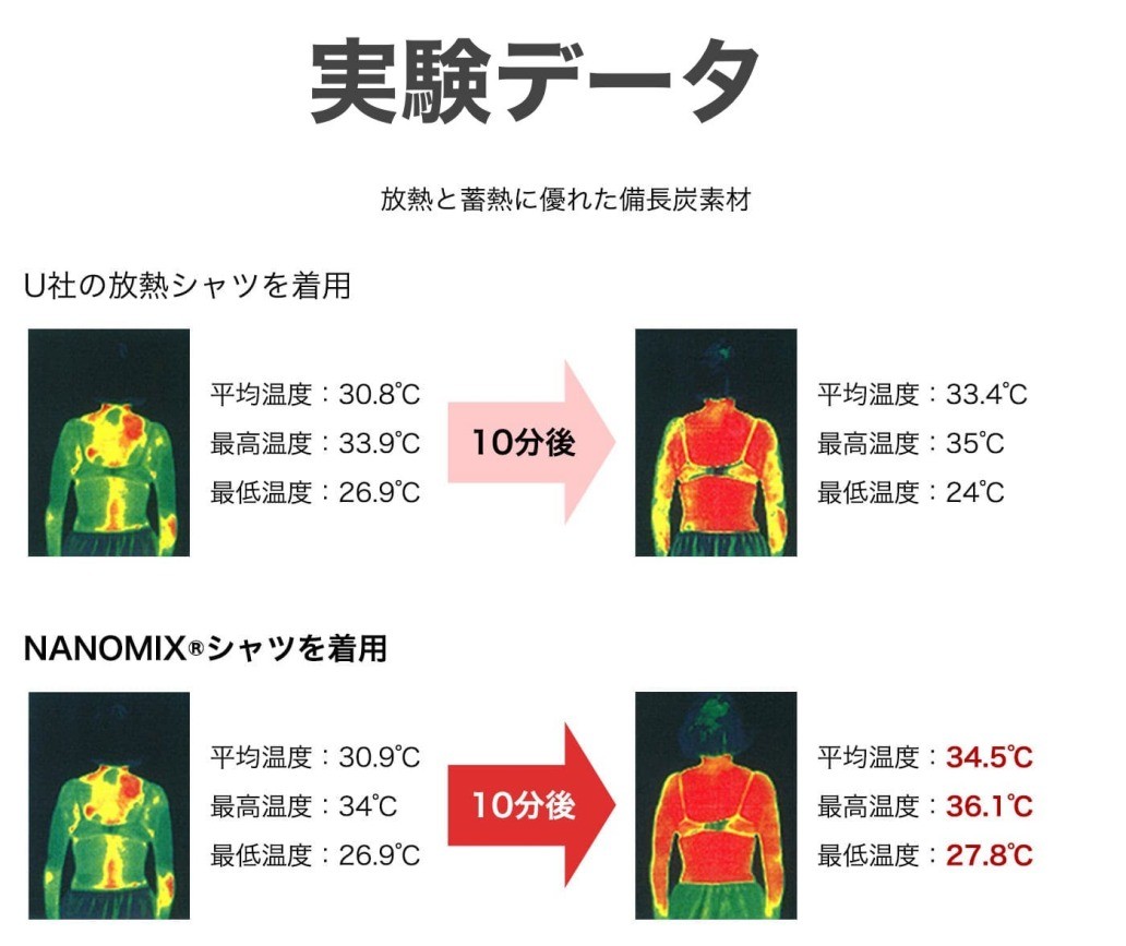 実験では、一般的な放熱シャツ(U社)とナノミックスのシャツを着用し、サーモグラフィと体温測定による比較が行われました。
