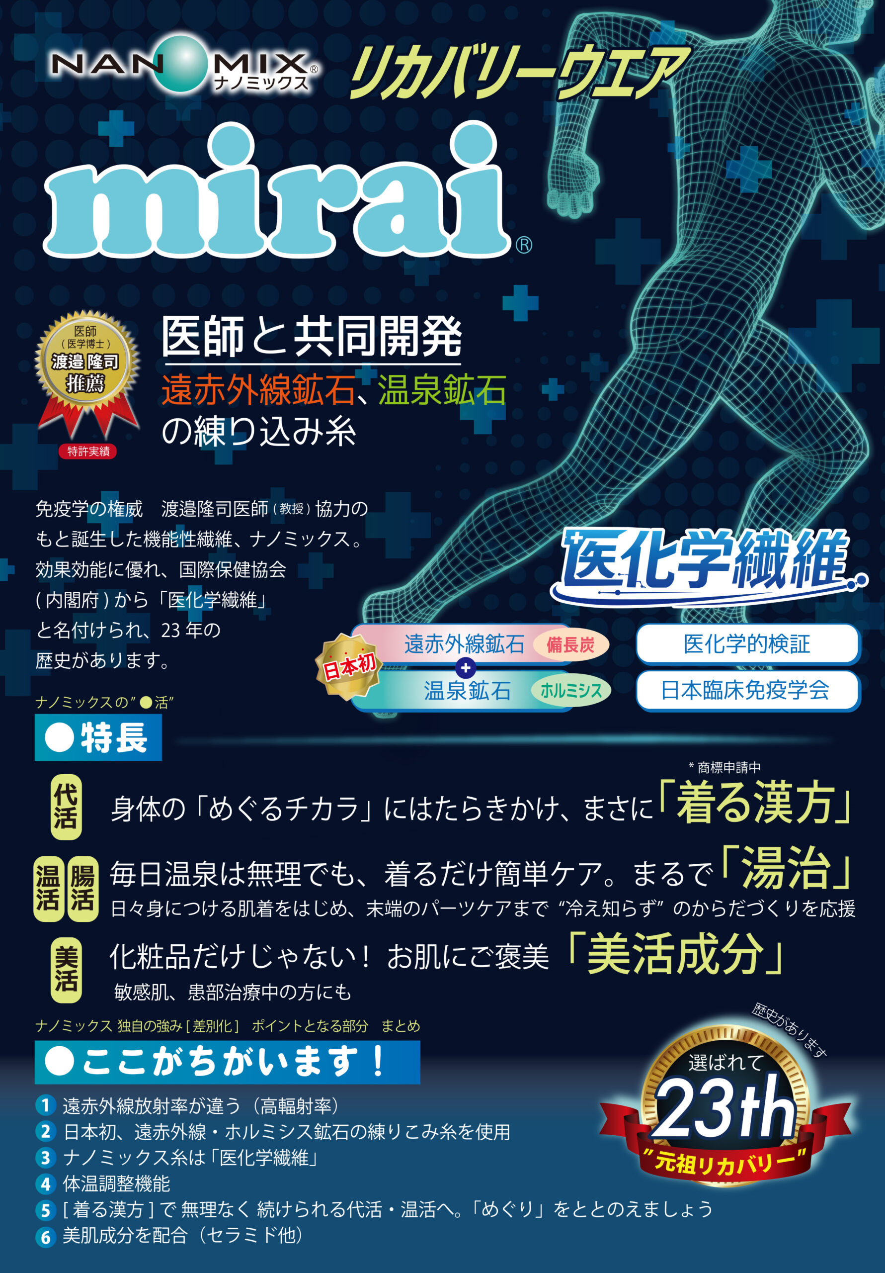 ナノミックス リカバリーウェア mirai は、敏感肌の方でも快適に着られるように設計されたコンディショニングウェアです。
